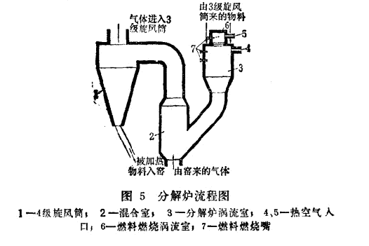 為了調(diào)整氣體動力學(xué)制度,分解爐內(nèi)設(shè)有節(jié)流閘板,它位于混合室的圓錐形異徑管下部。分解爐工作的特性為:它完全依賴于回轉(zhuǎn)窯的操作制度。分解過的生料粉進入渦流室同回轉(zhuǎn)窯出來的熱廢氣相混合,并依靠廢氣熱令生料粉達到85-90%的分解。從混合室出來的含生料粉的氣體進入第四級旋風(fēng)筒,生料粉在該筒內(nèi)與氣流分開,并沿傾斜溜管進入回轉(zhuǎn)窯內(nèi)。