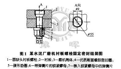 所以水泥廠從國外引進生料磨、水泥球磨機等多種設備投入運轉(zhuǎn)。其襯板固定螺栓采用了帶彈簧片的鎖緊螺母和碟形墊圈加優(yōu)質(zhì)耐溫像膠密封圈進行緊固和密密封等新型結(jié)構(gòu),使用多年來一直很理想,如圖1所示。