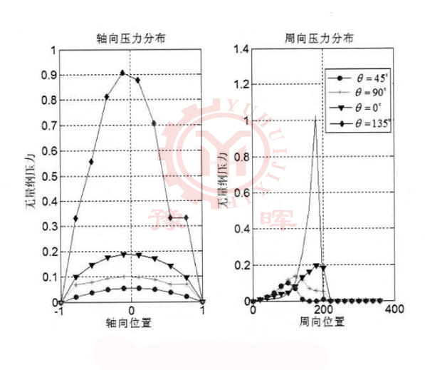 由不同旋轉(zhuǎn)角度下的球磨機(jī)橢圓軸處的油膜厚度分布情況我們可以知道,隨著橢圓的長軸圍繞主軸軸心做逆時(shí)針運(yùn)轉(zhuǎn),此時(shí)的動(dòng)靜壓軸處油膜厚度也會(huì)發(fā)生一定的變化,而較小油膜的厚度則是先增加后減小然后在增大的變化。同時(shí)我們還可以了解到球磨機(jī)油膜厚度會(huì)有兩個(gè)較低谷出現(xiàn),這些低谷則意味著動(dòng)壓油楔的產(chǎn)生,同時(shí)此區(qū)域也是我們所稱的動(dòng)壓力區(qū)。